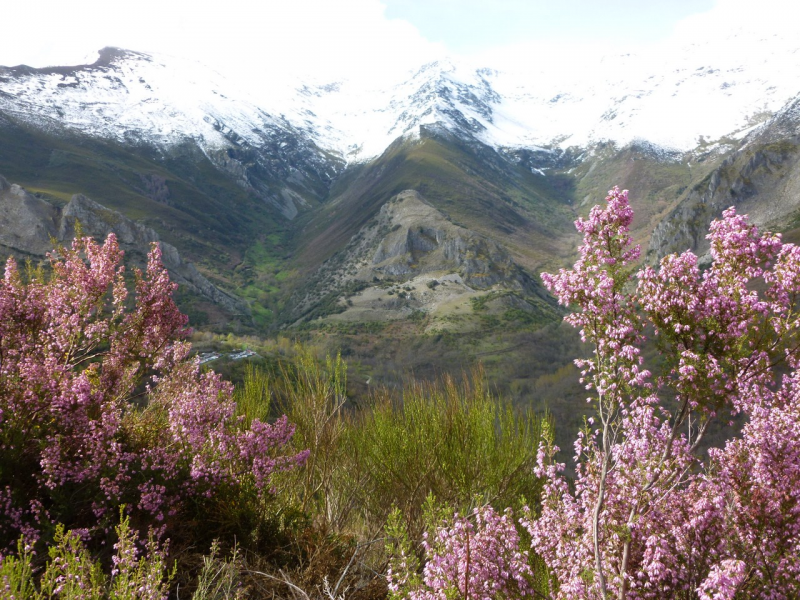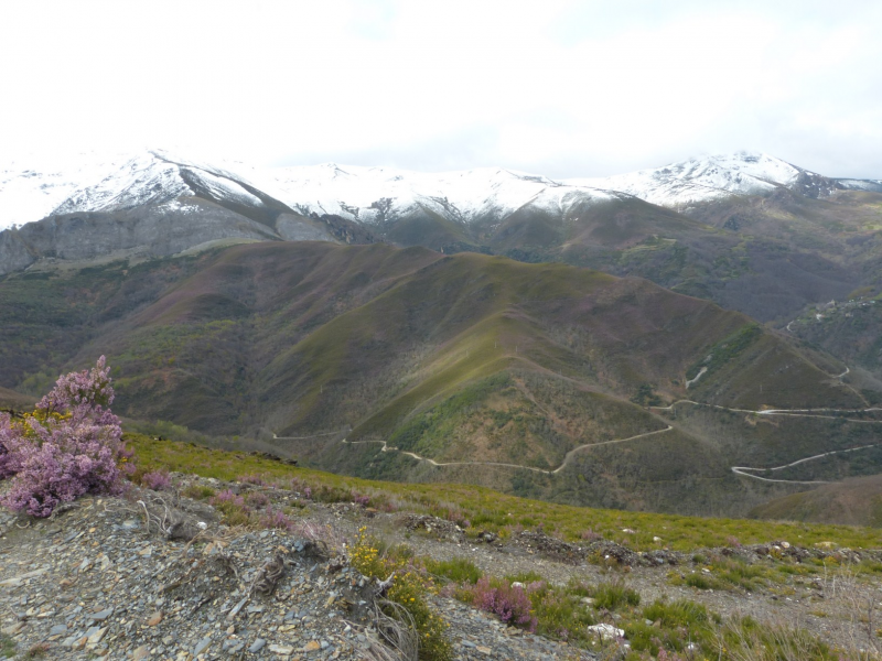 A medida que se asciende el paisaje va ganando en belleza. Abajo vemos Peñalba de Santiago y a la derecha las blancas montañas. En verdad, un paisaje difícil de superar.