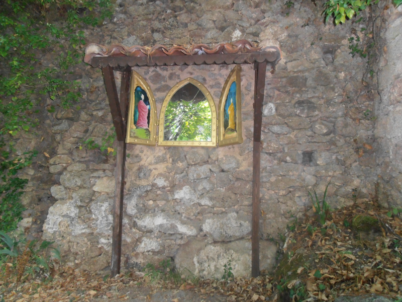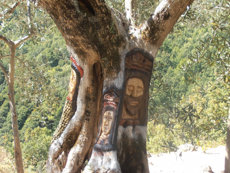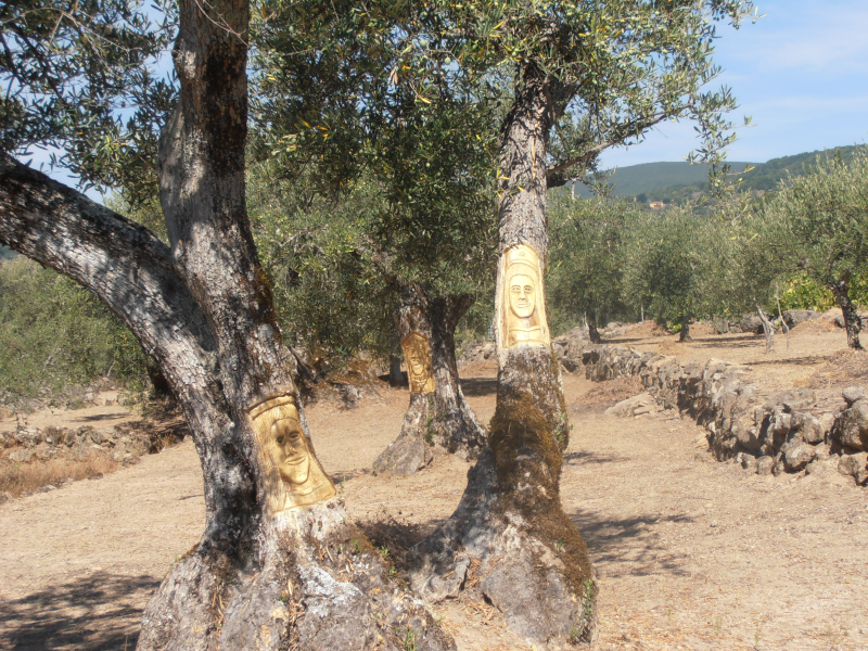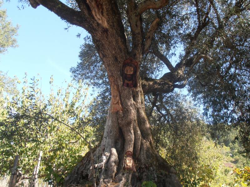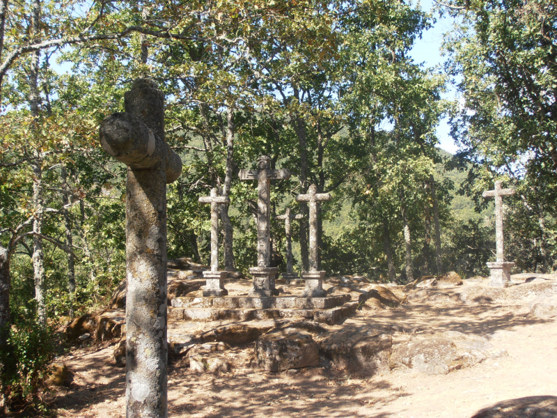 A la salida encontramos la iglesia entre olivos centenarios, con espectaculares grabaciones en sus troncos y que nos transmiten esas antiguas y viejas tradiciones del vareo de las aceitunas en la ejecución de las labores agrícolas. Entre huertos, olivos y viñedos aparecen cruces de granito que se mimetizan con los robles, llevándonos junto a un altar