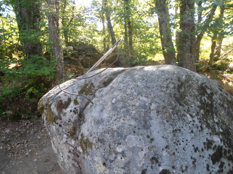 Seguimos aglutinando kms por el extenso robledal entre jóvenes y vetustos robles que amparan nuestro camino alcanzando un portentoso mirador entre grandes y redondeados bloques de piedras. Por el paraje de las Pozas del Caraba seguimos encontrando diferentes elementos esculturales que nos guían hasta el "Asentadero de los Curas", lugar donde se reunían el arcipreste y los párrocos del contorno para platicar sobre lo divino y lo humano. Al lado una gigantesca cabeza tallada en piedra de Creusot.