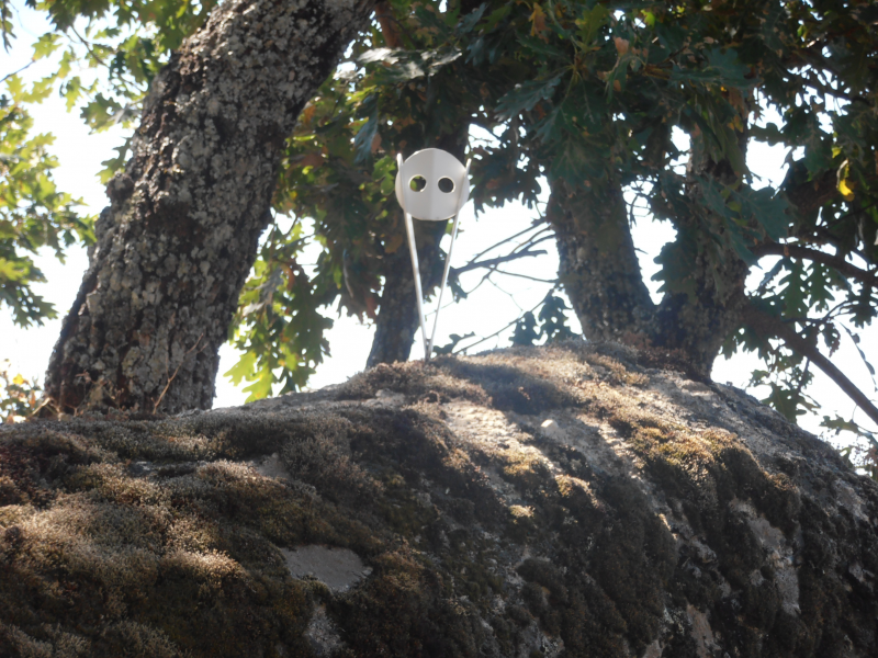 buscamos el camino que se dirige hacia san Martín del Castañar entre multitud de olivos y chumberas. Encontramos mas "Mochuelos" de Pablo Amargo en una zona con ligeras subida y bajadas hasta alcanzar "Al Otro Lado" de Manuel Pérez de Arrilucea, en una increíble unión entre lo humano y el paisaje, donde ambos se entienden y se respetan y en definitiva, una puerta abierta al campo en el bosque.. Un último esfuerzo en el recio repecho a nuestras espaldas, dibuja la Sierra de Béjar entrando en San Martín del Castañar.