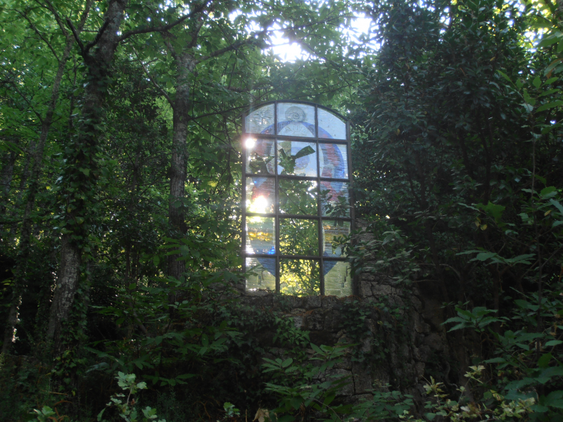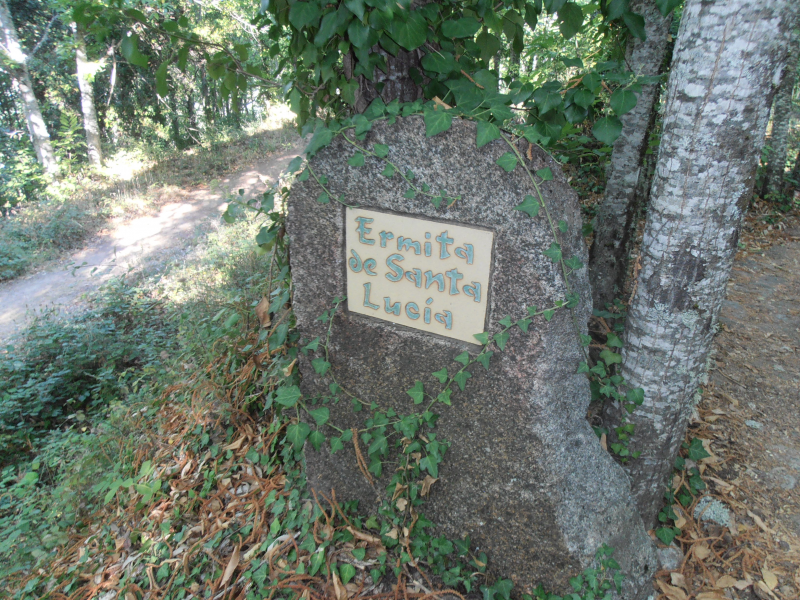 El repecho obliga a unos minutos de descanso para continuar por la parte alta de la ladera en un ascenso más leve, llegando a las ruinas de la Ermita de Santa Lucía con la obra escultórica "Vidrieras" de Yolanda Pérez y un curioso tríptico en una de sus paredes.