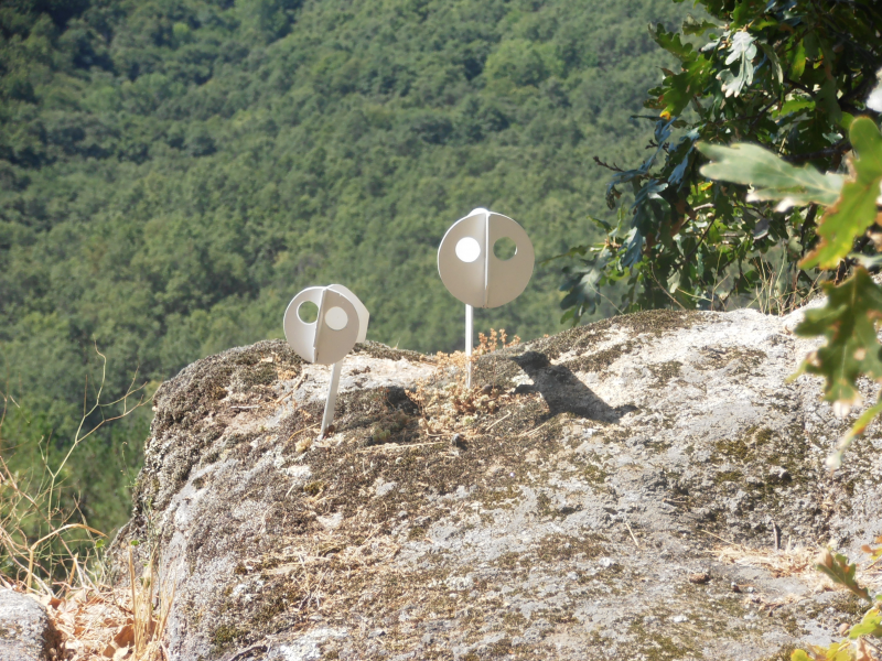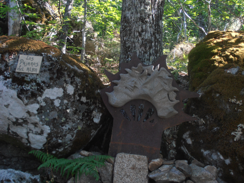 Vamos pasando hitos de madera decorados con imaginación y elegancia. Las siguientes obras arquitectónicas se designan "Pájaros del Alba" de Vicen Hernández y el sencillo y maravilloso "Luz" de Creusot, estampadas a la vista de la bella Sierra de Francia. Largos vallados de piedras nos protegen y nos resguardan entrando al municipio de Sequeros.