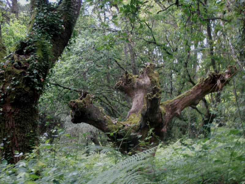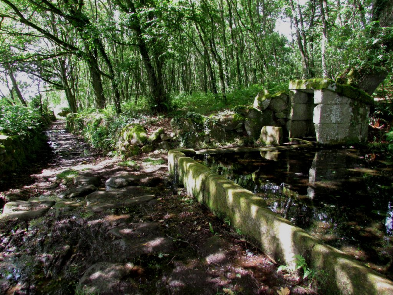 Entre hórreos y las incombustibles berzas gallegas cultivadas junto a las casas. Dejamos Bobadela por un camino que sube a mano derecha y que avanza entre una masa de robles. Luego se desvía a la izquierda y cruza una carretera para entrar en Padroso. Se sale junto al mojón que marca 133,077 a Santiago e inmediatamente después de un pilón de agua hay que girar a mano izquierda. Ascendemos, cruzamos un camino algo más amplio y llegamos a un paso entre unos riscos. Prestamos atención en la bajada y proseguimos por un sendero junto a una pequeña hilera de eucaliptos que dan paso a Cima de Vila.