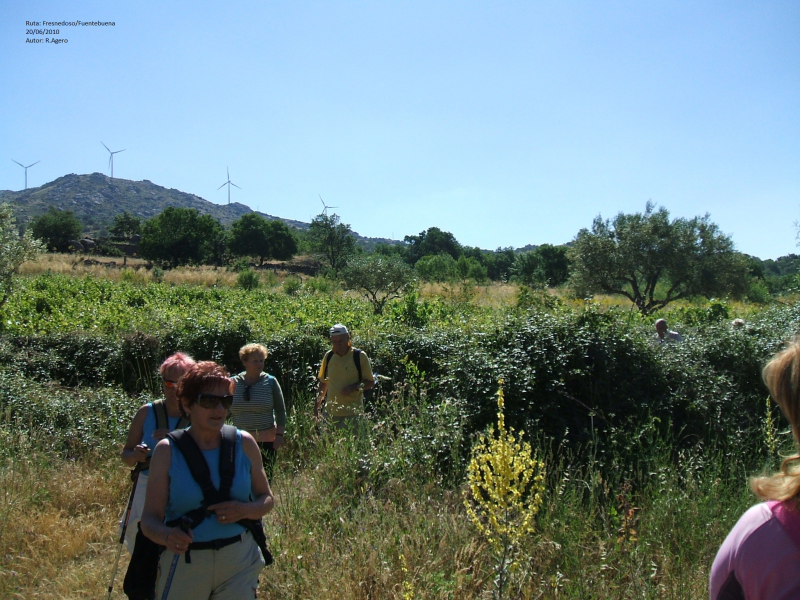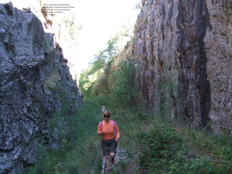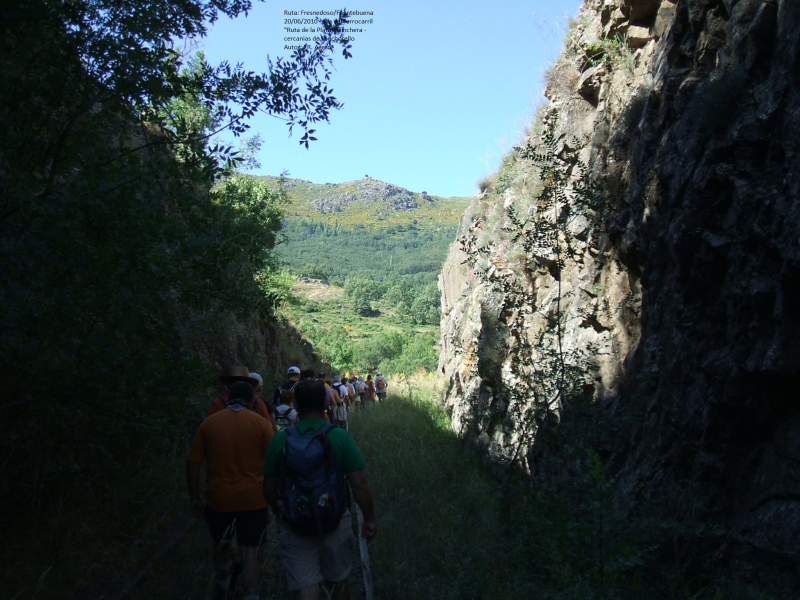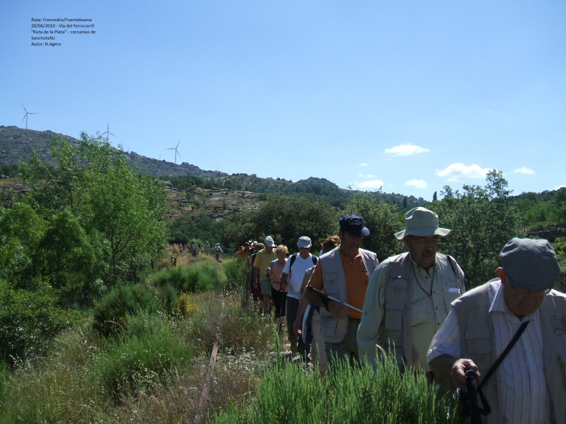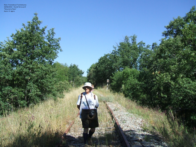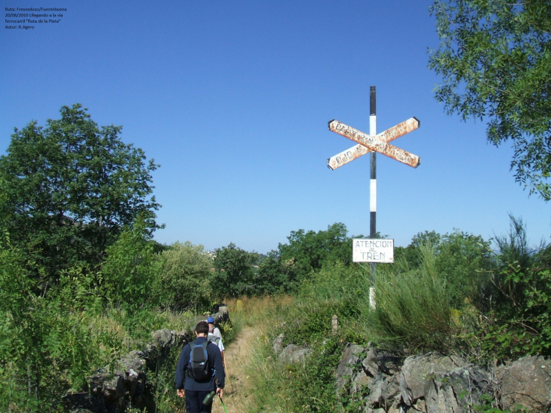 INICIAMOS LA RUTA EN EL VENTORRO DE FRESNEDOSO, NOS DIRIGIMOS AL PUEBLO DEL MISMO NOMBRE POR UNA CARRTERERA ASFALTADA (1 KM.), CRUZAMOS EL PUEBLO Y TOMAMOS UNA PISTA, EN PRINCIPIO ASFALTADA, ENTRE HUERTOS Y CON VISTAS DEL VALLE DEL SANGUSÍN HASTA ALCANZAR LA VÍA FÉRREA ( CAMINO DE LA pLATA), HOY EN DESUSO Y ABANDONADA, TRAS RECORRER UNOS 3 KM. PRÁCTICAMENTE LLANOS.
