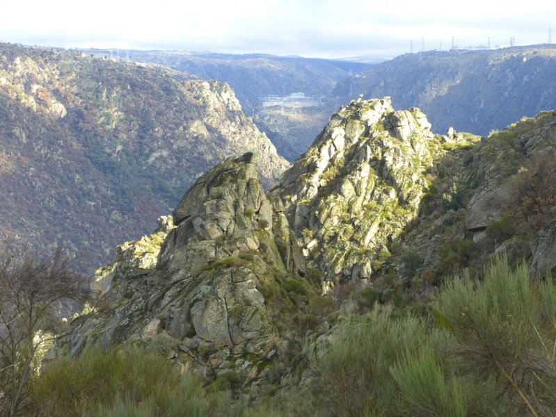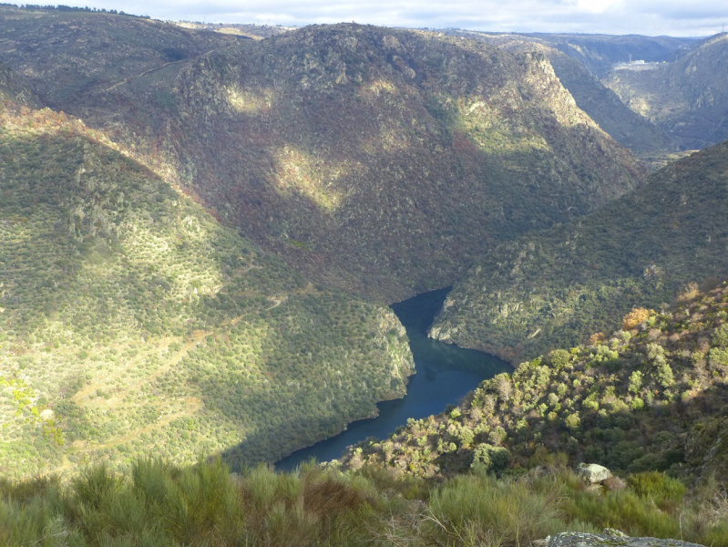 Vemos el Duero encajonado entre enormes paredes y a lo lejos la presa de Aldeadávila, el poblado de Iberdrola y el pueblo de Lagoaça en la parte portuguesa.