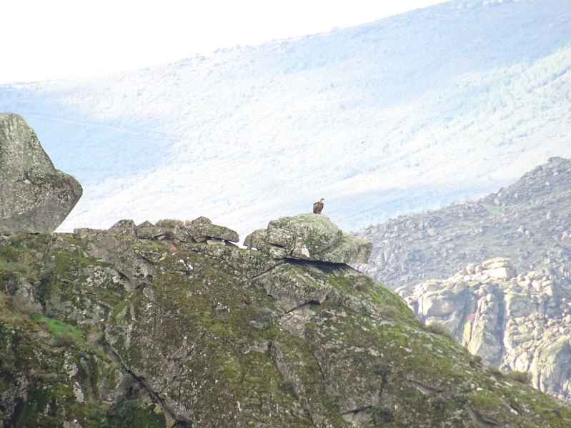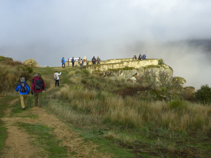 Tras varios cruces llegamos primero al merendero, con mesas y bancos de granito, y al poco al Mirador de la Peña del Águila.