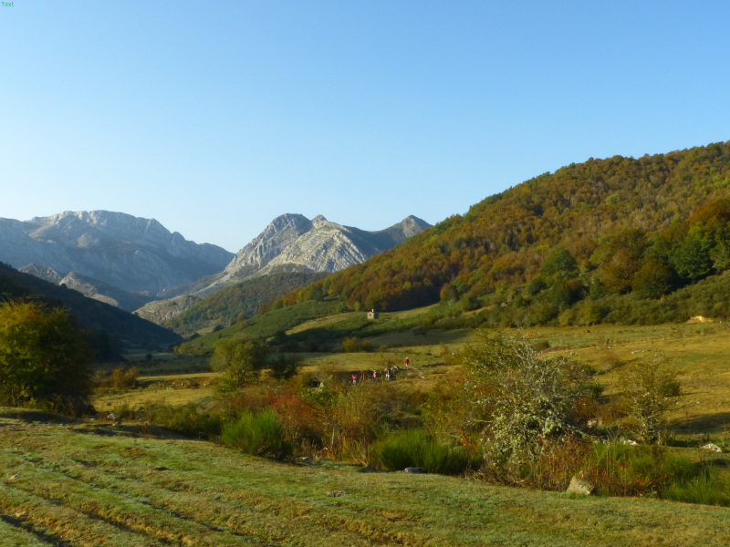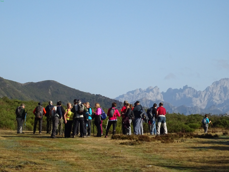 Desde aquí el camino se empina considerablemente, pasaremos de 1.200 m. a 1.400 en 1 Km., para adentrarnos en el bosque encontrándonos grandes robles y hayas para alcanzar al Collao del Prado Llao, una zona abierta desde la que tenemos vistas impresionantes, con espectacular panorámica de los Picos de Europa.