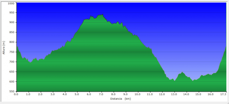 Continuamos entre campos de cerezos, olivos, robles y castaños de gran porte, ahora en ascenso, hasta llegar a un cruce, llegando a la cota 910 mt., máxima de la ruta.