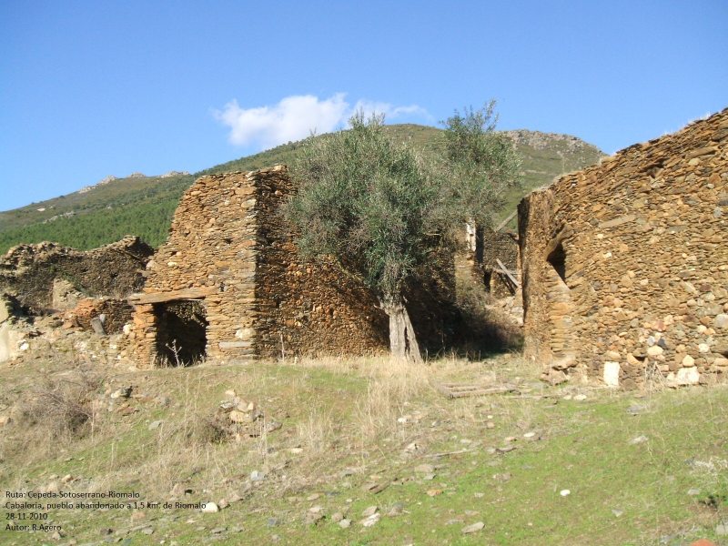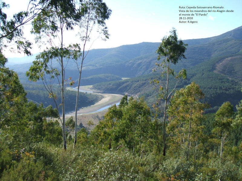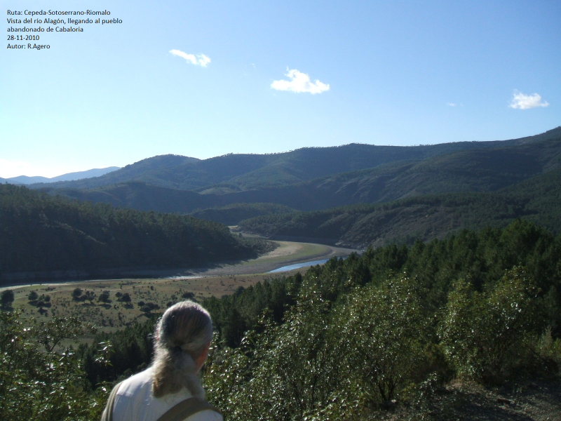 Después de una parada obligada para admirar las impresionantes vistas de los meandros del río Alagón (con la zona de sedimentación del río en la provincia de salamanca y la zona erosiva en la provincia de Cáceres, ya que en esta zona, el río marca el límite entra las dos provincias), continuamos la ruta, descendiendo por la cara O. de el El Pardo sin perder de vista el río, hasta un cruce de pistas, tomamos la primera pista a la derecha, según el sentido de nuestra marcha, que nos conduce hasta las ruinas de Cabaloria (pueblo abandonado al construirse el pantano de Gabriel y Galán ya que se pensó que quedaría inundado), cruzamos este pueblo abandonado y llegamos a la carretera SA-225, que tomamos a nuestra izquierda y que nos conduce a nuestro final de la etapa Río Malo de Abajo (alquería perteneciente al concejo de Caminomorisco, Cáceres) (393 mts.)