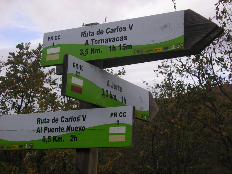 Posteriormente y tras 3,8 Km. Aprox. abandonaremos la ruta de Carlos V, que nos llevaría a la Garganta del Infierno, para seguir por senda que en ocasiones va junto al río Jerte, para llegar a la población de Jerte, de la que nos separa el puente Largo. Llevaremos 7 Km. Aprox. Desde el inicio.