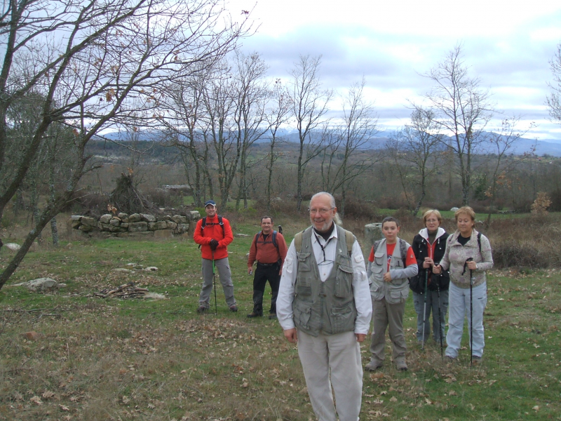 El paisaje lo forman algunas encinas diseminadas por el pasto y dos cercas de hormigón y alambre que delimitan la anchura del cordel. En una hora llegaremos hasta el arroyo de Navalcuervo y tras un pequeño repecho a un encinar donde se alza una cruz de madera y una choza construida con ramas. Seguimos entre las encinas y después de una portilla giramos a la izquierda y cien metros más adelante a la derecha. Unas flechas en la cancela de la finca nos invitan a entrar, aunque es mejor continuar por fuera y siempre paralelos a la valla. Caminamos campo a través, con la referencia de la valla de alambre y la de las flechas amarillas que están pintadas sobre las piedras. Después de pasar otra cancela, en el kilómetro 8,5 de la etapa, la pista se hace más patente. Hay que seguir por ella y para llegar al cruce de caminos, donde realmente termina la etapa, pero nosotros giraremos a la izquierda para llegar a Navarredonda de Salvatierra donde nos espera el autobús para trasladarnos a frades de la Sierra