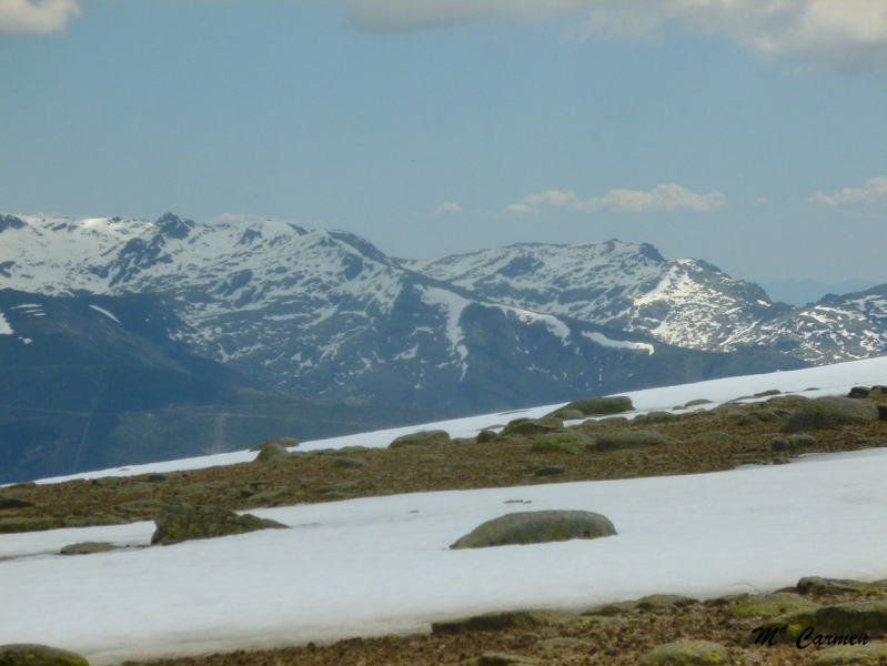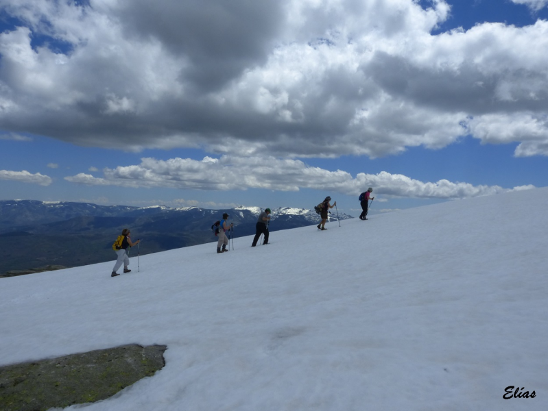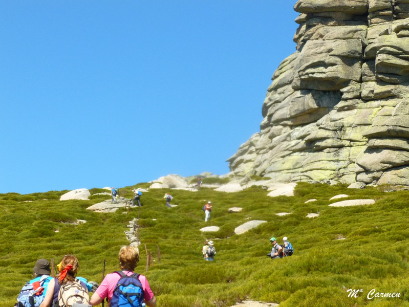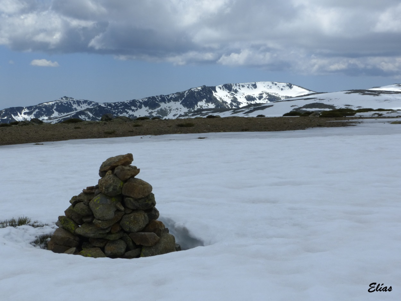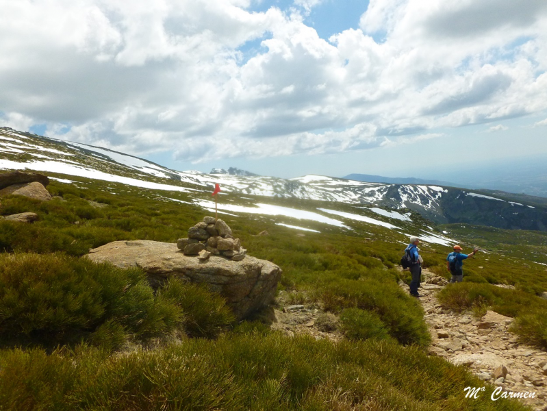En llegar hasta donde desaparece la pista se pueden tardar unos cincuenta minutos desde el puerto, y allí se debe buscar algún punto por donde cruzar la pared y tomar las veredas que la siguen por el otro lado. A la derecha, en la cuerda, hay algunos peñascos (Peña de Garci Sánchez y Peñas Negrillas) que no debéis confundir con vuestro objetivo.